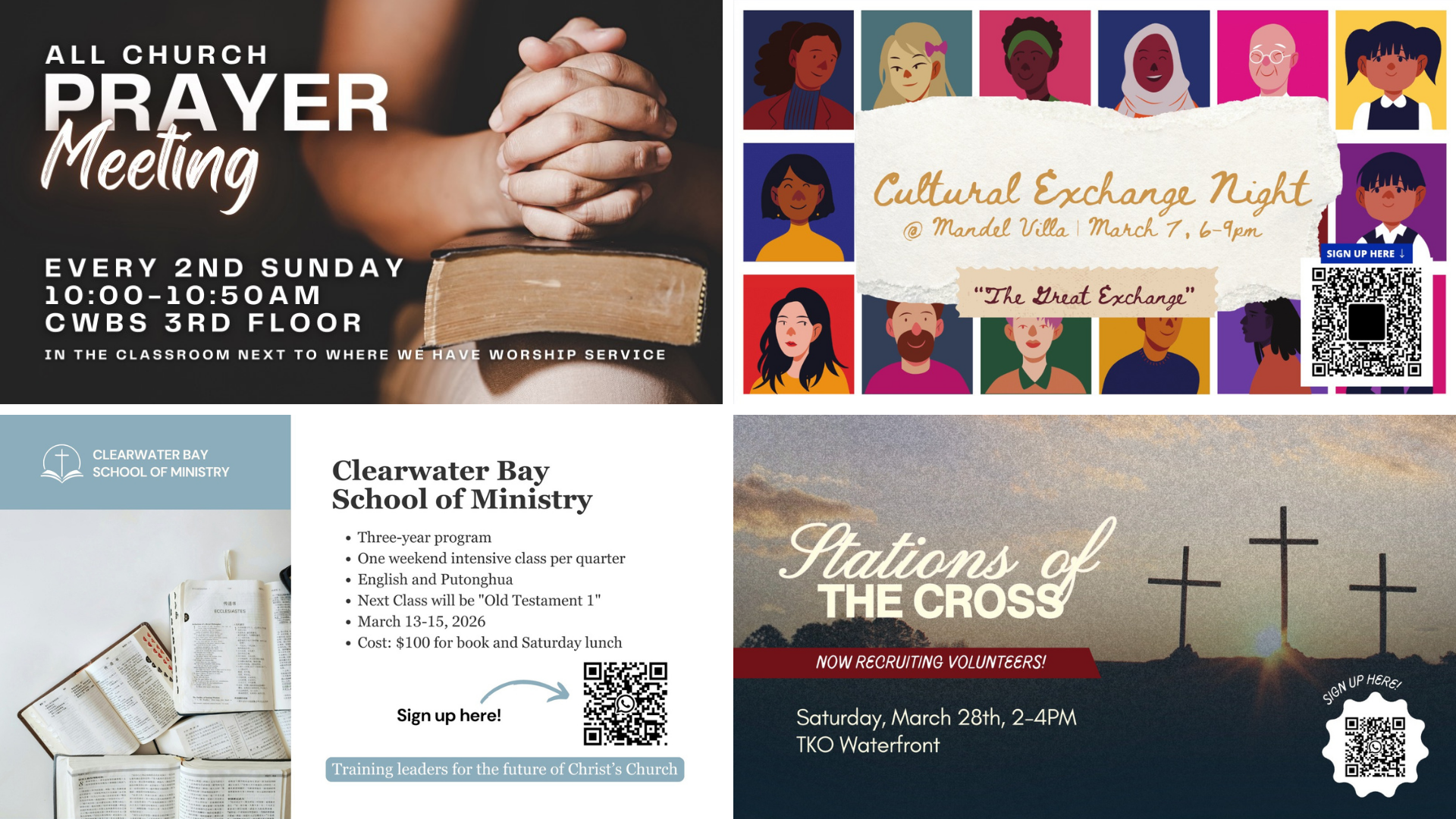 Clearwater Bay School of Ministry on March 13-15: Our next session of the Clearwater Bay School of Ministry will cover the first half of the Old Testament, and it’s going to be a great place to start if you want to understand the Bible and its message more clearly. If you would like to sign up, please tap the link to be added to the group.